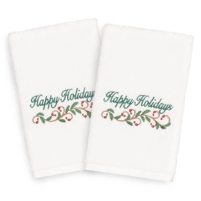 This Holiday towel set will add luxury and festive spirit to your powder room decor! Made of 100% Turkish Cotton with more cotton per square inch, these fluffy hand towels feature maximum softness and absorbency, with a fun and colorful embroidered holiday design. Each hand towel measures 16″ x 30″, and gets softer with each washing. Excellent for holiday gift giving!