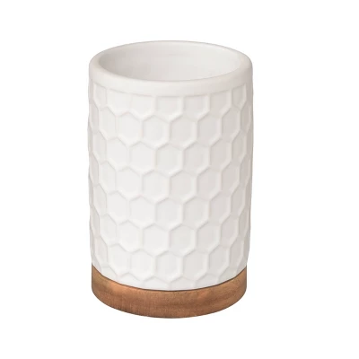 - White ceramic with wood, this bathroom coordinate set brings function and style to your bath space