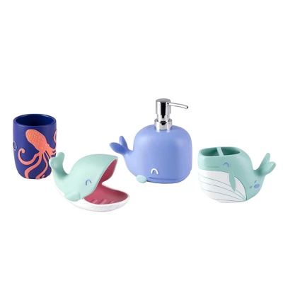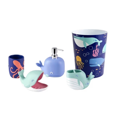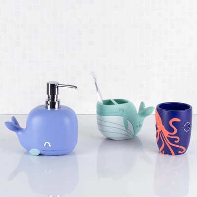- Whimsical whales with sea friends design 3-Piece Bath Accessory Set includes 1 ea.-Lotion Pump, Toothbrush Holder and Tumbler