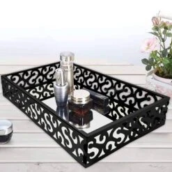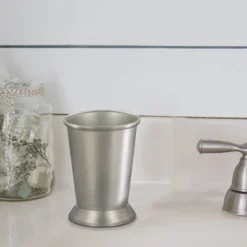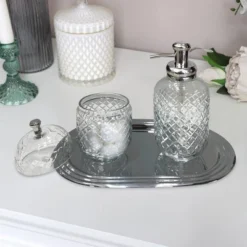 Set Of 3 Emory Glass & Chrome Soap Pump & Q-tip Jar Set With Vanity Tray Metallic Silver – Nu Steel