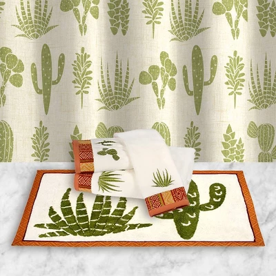 Pamper your feet and bring the vibrant spirit of the desert into your bathroom with the Destinations Southwest Cactus Rug. The plush tufted 100% cotton rug is adorned with vibrant green succulents and bound with a traditional Aztec print, keeping your feet clean and dry. The bath rug measures 20″ x 30″.