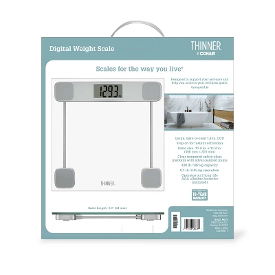 Measure and manage your weight with the Thinner® by Conair® Digital Weight Scale. Step onto the wide, comfortable platform to automatically engage the scale, and in moments, your weight appears on the large 1.4 in. (36 mm) LCD display. Measurements are calculated in 0.1 lb. (0.05 kg) increments, ideal for monitoring progress to support any weight management program. The scale’s sophisticated design features a clear tempered safety glass surface with silver-painted frame that gives it an elegant, contemporary look, elevating the aesthetic of any bedroom or bathroom. Its broad 11.8 in. x 11.8 in. (300 mm x 300 mm) platform and low 0.9 in. (23 mm) rise make it easy to operate—simply step on the scale to turn it on, stand in place, and in moments, your weight appears on the easy-to-read display screen. The scale’s low profile makes it compact and easy to store, too. Durably built, the scale can measure weight up to 400 lb. (182 kg). The scale operates on 2 long-life AAA alkaline batteries (included), ensuring you won’t have to fumble with frequent battery changes.