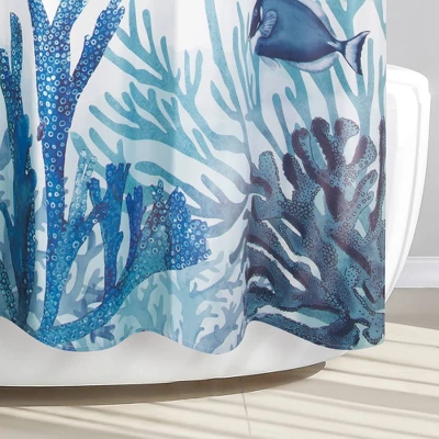 Transform your bathroom into an underwater oasis with the Deep Blue Sea Shower Curtain by Allure Home Creation. This oversized design in soothing shades of blue against a white ground, features gliding turtles exploring the depths and beauty of the sea. A must have for the ocean inspired bathroom. This printed shower curtain measures 70″ x 72″ and fits most standard sized tubs and shower areas providing privacy and protection from water splashing onto the floor. Crafted from 100% easy care microfiber polyester fabric with a reinforced buttonhole top that works well with standard shower hooks and curtain rods. Use of a liner is recommended. Machine wash cold on gentle cycle and tumble dry on low heat.