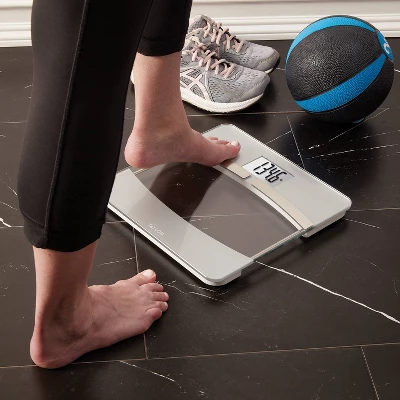- Beautiful clear glass and metallic silver platform complimented by brushed stainless steel body composition scale.