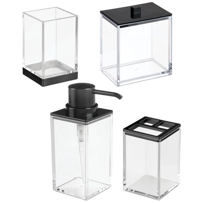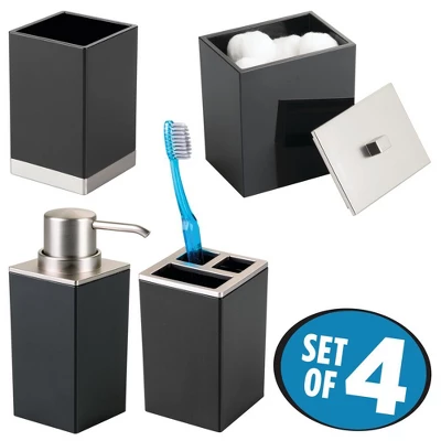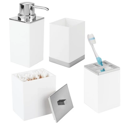 Make a style statement on your bathroom vanity or counter top with this Bathroom Accessory Set from mDesign. The soap dispenser holds up to 10 ounces of soap or lotion. The toothbrush holder has three slotted sections to keep toothbrushes separated and organized. The lidded storage canister is perfect for cotton balls, swabs and bath salts. Use the tumbler for drinking, rinsing, or makeup brush storage!