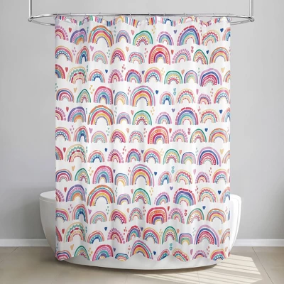 Create an enchanting atmosphere in your bathroom with the Rainbow Hearts Shower Curtain by Allure Home Creation. This cheerful full coverage print, in refreshing multi-colored brights on a white background, features artsy rainbows mixed with romantic hearts. This eye-catching design is perfect for kids and tweens and will surely dress up and enliven their bath space. This shower curtain measures 70″ x 72″ and fits most standard sized tubs and shower areas providing privacy and protection from water splashing onto the floor. Crafted from 100% easy care polyester taffeta fabric with a reinforced buttonhole top that works well with standard shower hooks and curtain rods. Use of a liner is recommended. Machine wash and tumble dry on low heat. Complete the look by coordinating with other pieces in the Rainbow Hearts Bath Collection or use alone.