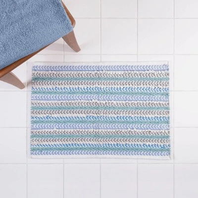 Pamper yourself with style and comfort with the Multi Stripe Cool Bath Rug by Allure Home Creation. This stylish design in a cool pallet of white, grey, aqua, light and medium blue, features a blend of textural designs woven together in a horizontal striped pattern adding lots of visual interest and dimension. This oblong bath rug is made of 100% cotton with a skid resistant latex backing. It measures 20″ x 30″ and will easily fit in most spaces where you want to create a cozy, soft spot to stand. Not only will this bath rug fashionably dress your bathroom, it will also help keep your floor clean and dry. Machine wash cold and tumble dry on low heat.