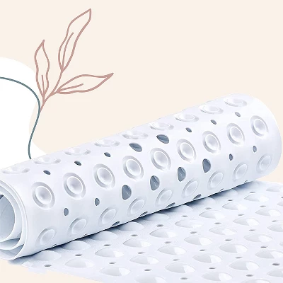 Tranquil Beauty offers luxurious and durable bath mats. Our 40x16in rubber mats feature suction cups for a non-slip experience. Easily removable for maintenance, our mats fit all types of roll top, curved, and round baths. Available in white, our modern square design is perfect for any shower room. Created with children and elderly in mind. The suction cups keep the mat securely in place, while the textured surface prevents slipping. The mat is made of durable, high-quality materials that are easy to clean.
