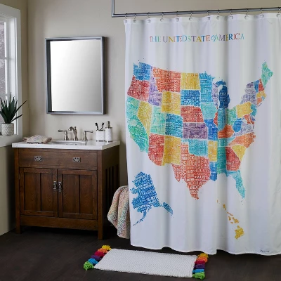 Make bath time educational or just show off your love for the USA with the United States PEVA shower curtain by SKL Home. This vibrant shower curtain features a colorful map of the United States of America and corresponding cities. 12-button holes line the top for easy hanging. Use of a liner is recommended; liner/hooks sold separately.