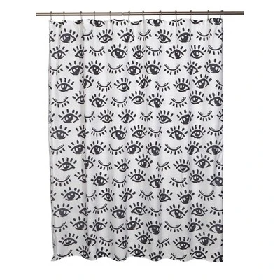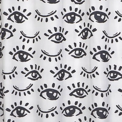 The WINKING EYE Shower Curtain by Moda, is a fun look for the young at heart. This shower curtain is printed In classic black on white, it is versatile to accent with a bright coordinate. This lightweight shower curtain has a Micro Fibre finish and made of 100% Polyester making it machine washable.